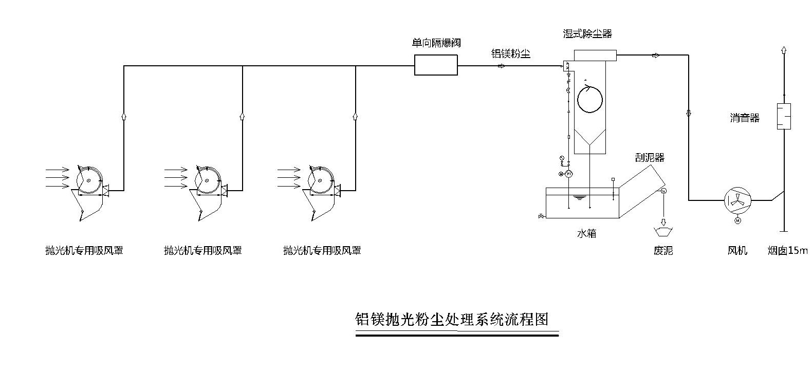 在原有的拋光機上設計專用的吸風罩,吸風罩有效捕集鋁鎂粉塵收集效率達到95%以上,粉塵通過管道輸送到濕式除塵器,再經過濕式除塵器,粉塵顆粒物與水充分接觸,去除其中大部分顆粒污染物,去除效率高于95%,處理后的氣體可以通過室外煙囪直接排放到大氣中。
