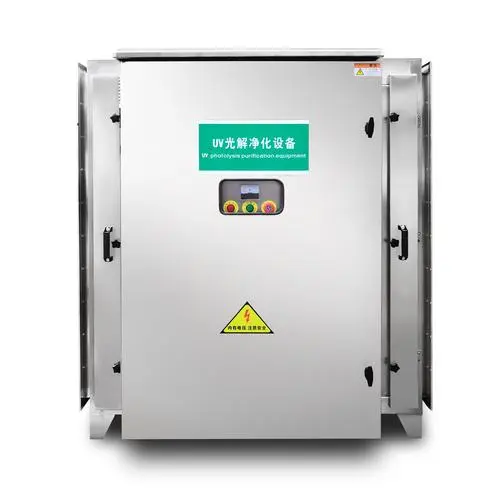 uv光解除臭設備:有機廢氣氣體處用排風設備輸入到UV光解設備后,運用高能UV紫外線光束及臭氧對惡臭氣體進行協同分解氧化反應,使惡臭氣體物質其降解化成低分子化合物、水和二氧化碳,再通過排風管道排出室外。
