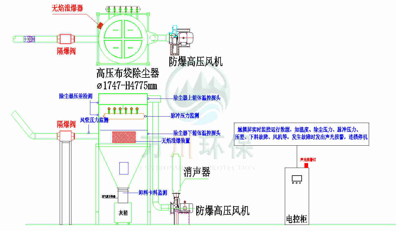 萬川配套一套脈沖布袋除塵器+防靜電布袋+防爆除塵風機+防爆卸料器+無焰泄爆器+隔爆+自動化電控柜系統(tǒng)。