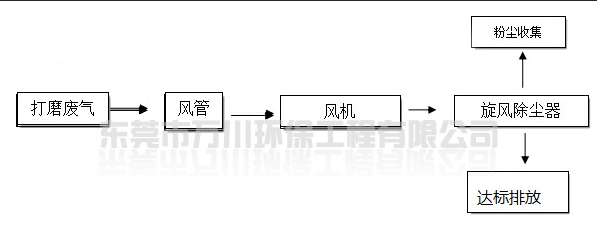 二樓的切削打磨屬于粉塵廢氣,打磨拋光時所產生的粉塵通過收集由引風機抽至車間外。本方案設計設粉塵廢氣處理系統(tǒng)二套,處理能力為15000m3/h,系統(tǒng)設于車間一樓。